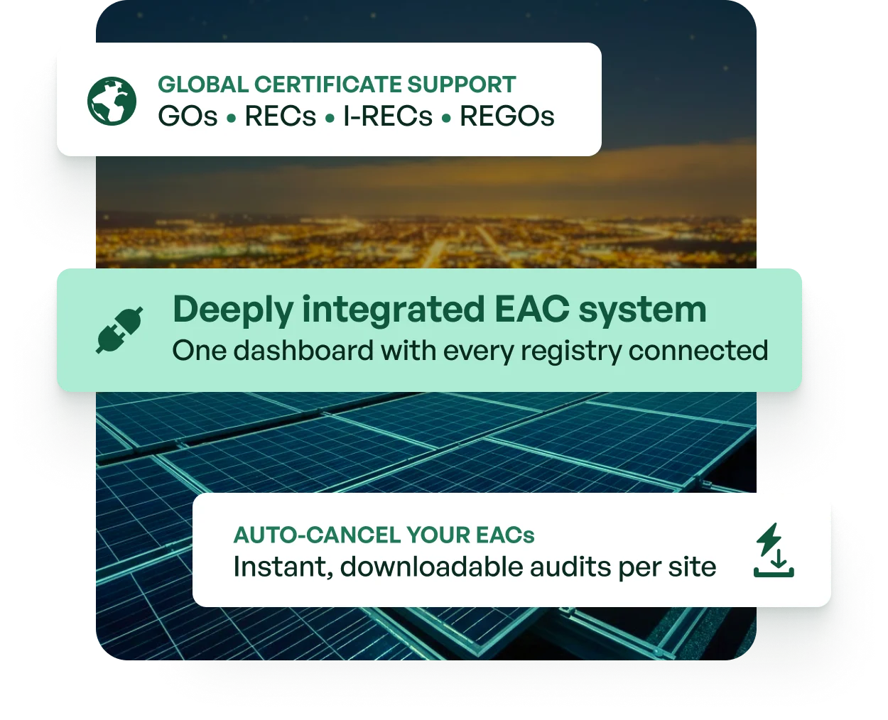Me eemaldame taastuvenergia hankimise ja dokumenteerimisega seotud keerukuse, pakkudes läbipaistvat kolmandate osapoolte hinnastamist, automatiseeritud arveldusi ja piiriülest vastavust.